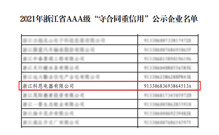 根據(jù)《浙江省“守合同重信用”企業(yè)公示辦法》規(guī)定,由企業(yè)自愿申報、系統(tǒng)自動測評、各地核實推薦、大數(shù)據(jù)比對和雙隨機實地核查,2021年浙江省AAA級“守合同重信用”企業(yè)公示名單出爐,憑借著誠信守法的“契約”精神,嚴謹規(guī)范的合同管理體系以及良好的經(jīng)營效益,進一步強化“守法”意識的浙江科恩電器有限公司榮獲浙江省AAA級“守合同重信用”榮譽。