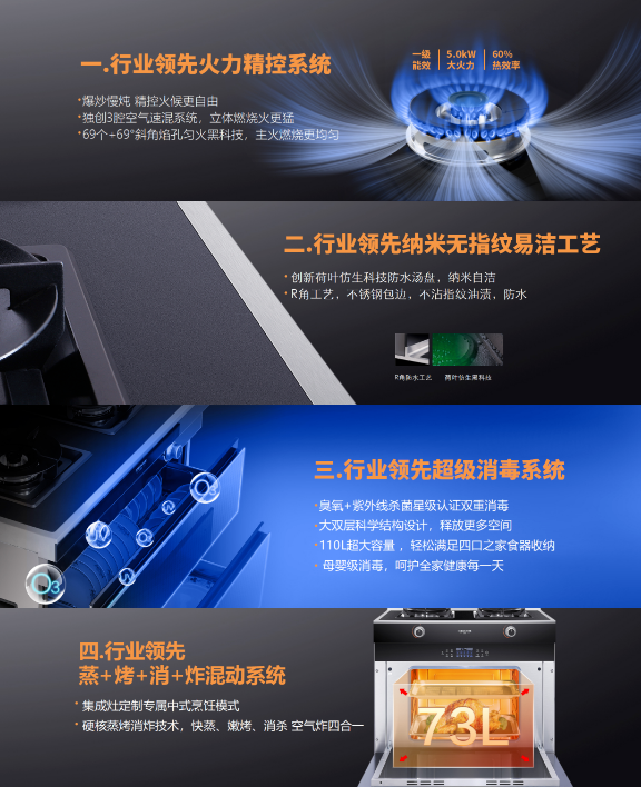 C系列集成灶配備的四項行業(yè)領(lǐng)先創(chuàng)新技術(shù):火力精控系統(tǒng)、納米無指紋易潔工藝、超級消毒系統(tǒng)、蒸烤消炸混動系統(tǒng)——直擊當(dāng)下消費痛點,徹底解決用戶使用需求,從大火力大吸力、易清潔易打理、廣收納懂消殺、多功能全集成四個維度力破當(dāng)下行業(yè)四大頑固堵點。