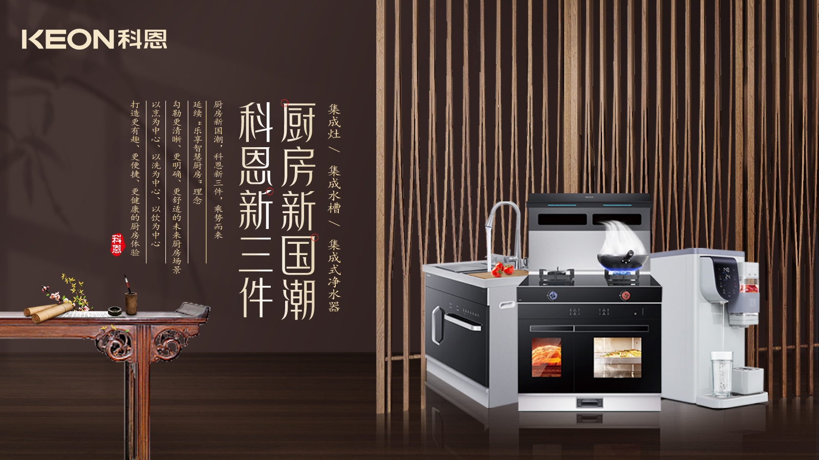 廚房新國潮,科恩新三件,樂享智慧廚房,科恩電器形成以“集成灶、集成水槽、多功能移動凈水器”的科恩新三件,打造廚房新國潮,于方寸間體會更多愜意,于細(xì)微處,感受更多用心!