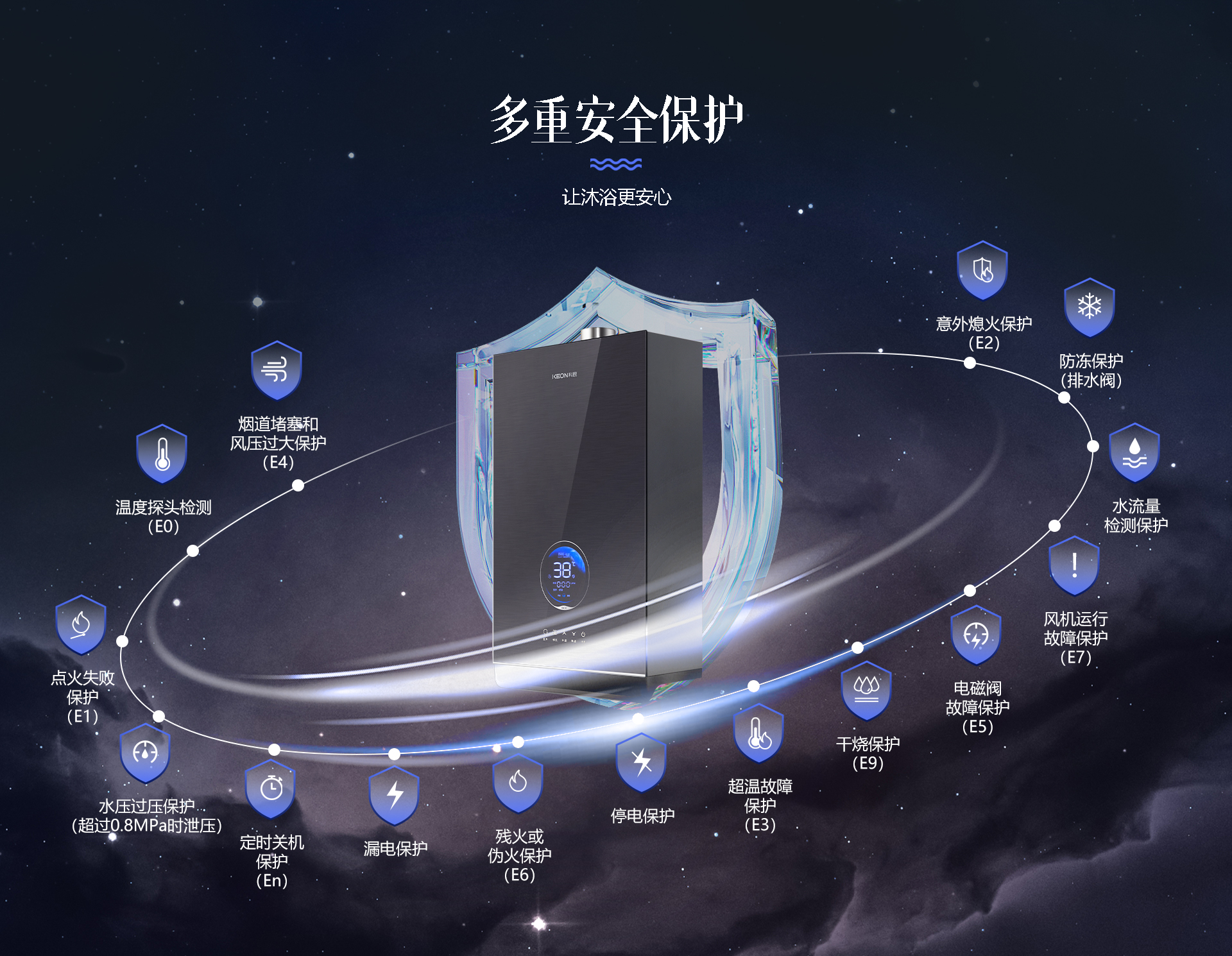 其次,關(guān)注熱水器的安全性能。科恩16KN66具有多重安全保護(hù),包含:多項(xiàng)自檢和保護(hù)功能,保證熱水器正常工作。溫度探頭檢測(cè)(E0)、點(diǎn)火失敗保護(hù)(E1)、意外熄火保護(hù)(E2)、超溫故障保護(hù)(E3)、煙道堵塞和風(fēng)壓過(guò)大保護(hù)(E4)、電磁閥故障保護(hù)(E5)、殘火或偽火保護(hù)(E6)、風(fēng)機(jī)運(yùn)行故障保護(hù)(E7)、干燒保護(hù)(E9)、停電保護(hù)(EE)、水壓過(guò)壓保護(hù)(超過(guò)0.8MPa時(shí)泄壓)、防凍護(hù)保護(hù)(排水閥)、水流量檢測(cè)保護(hù)、漏電保護(hù)、定時(shí)關(guān)機(jī)保護(hù)(En)等安全防護(hù)。