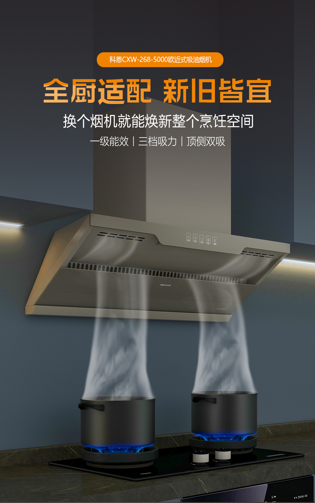 嵌入美學,颶風凈界。科恩歐近式吸油煙機5000,275mm纖薄機身平行嵌入櫥柜。太空灰如暮色浸染,適配任意風格,敞開式攏煙區擴大50%,科恩爆炒時颶風瞬吸,辣味未散油煙已凈。舊廚房的逆襲法則,獨立安裝不挑戶型,嵌入即高級。IP67級LED冷光燈穿透蒸汽迷霧;兩檔吸力+爆炒模式;3分鐘延時凈煙,余味消散無蹤;老破小廚房秒變開放式料理廳。