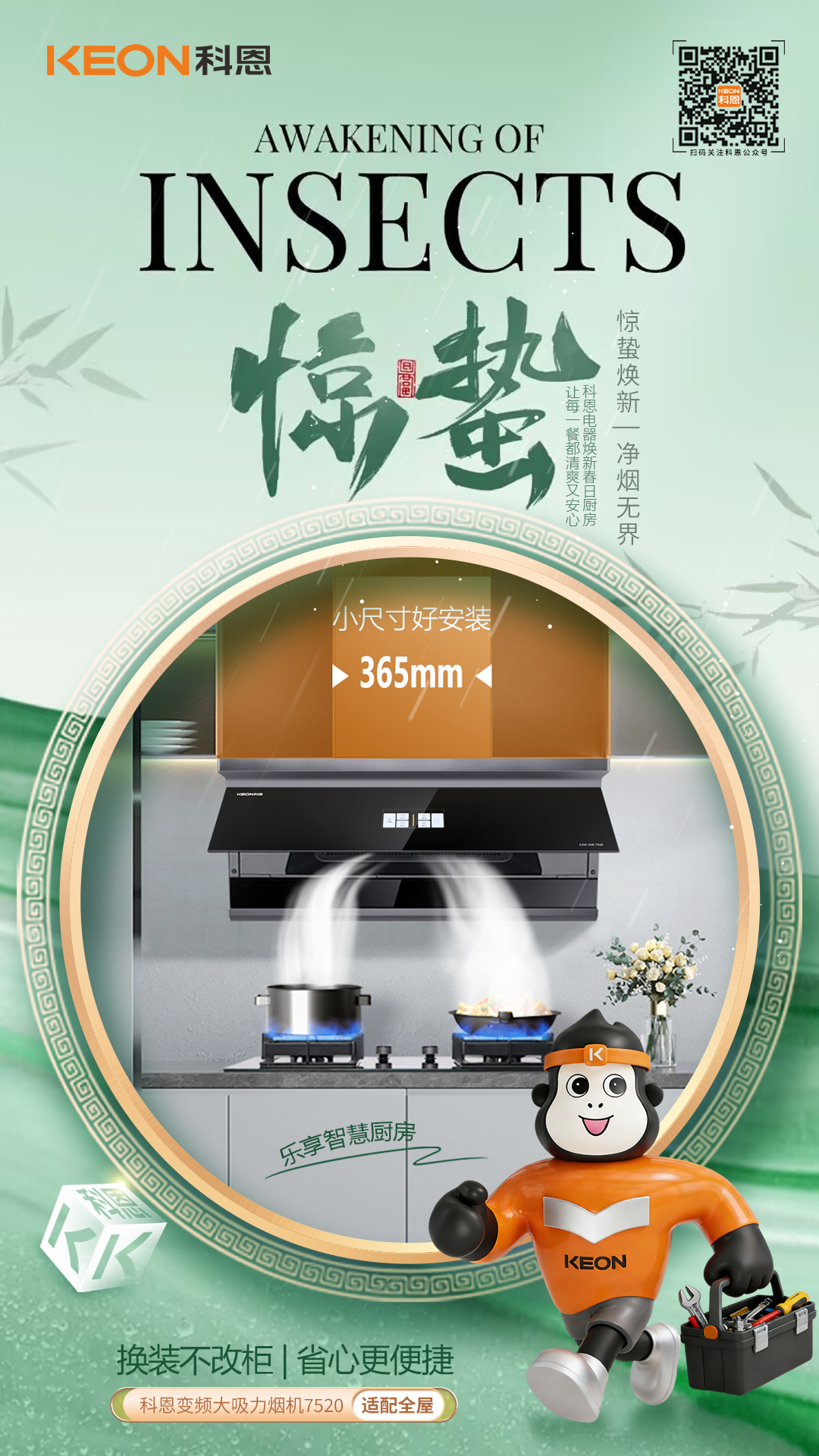 驚蟄啟灶,油煙匿跡春雷乍響萬物蘇,廚房煥新正當時舊機乏力煙彌漫,烹飪興致打折扣科恩煙機7520登場,以巧裝強吸破局櫥柜零改煥新顏,油煙速凈享清新巧裝適配,省心煥新驚蟄換廚不用愁,小圍設計解煩憂365mm纖薄圍板,多柜適配無壓力免拆櫥柜直接裝,老房煥新省工時無需大動干戈改,新機即刻入廚房颶風強吸,煙消無形春雷伴炒煙火起,強吸速排不等待28m³/min颶風吸力,爆炒油煙瞬間凈1060Pa高風壓值,煙道擁堵輕松破烹飪高峰排煙暢,廚房空氣常清新