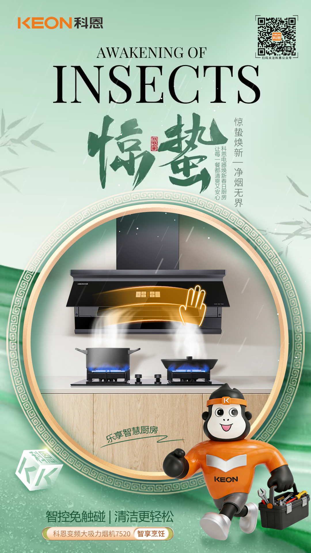 春雷啟驚蟄,煥廚正當時,科恩大吸力煙機7520,以巧裝破局,以強吸凈味,以智能省心一灶春風,一室清新,讓廚房告別油煙困擾,讓烹飪回歸自在從容。驚蟄煥新,選科恩7520,凈享健康無煙,悅啟春日美好廚居生活!