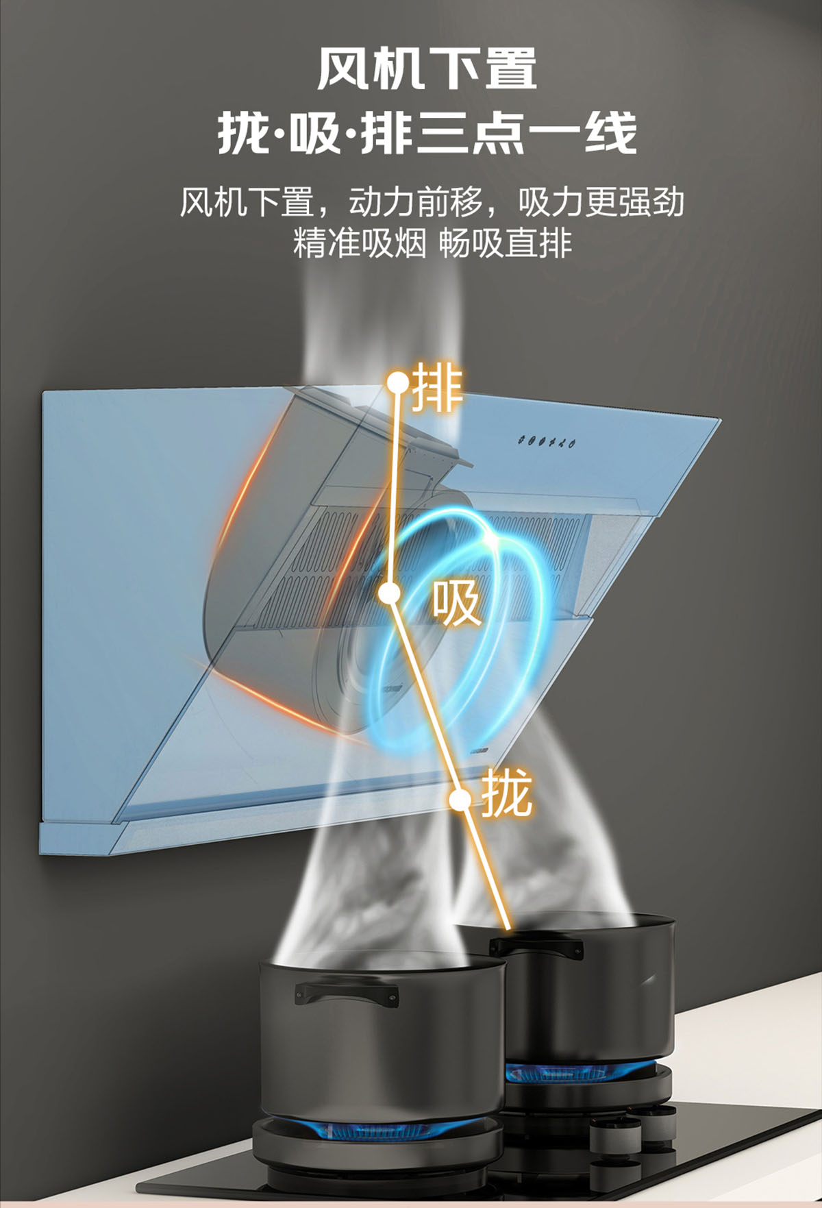 - 攏、吸、排三點一線,暢吸直排,高效凈煙