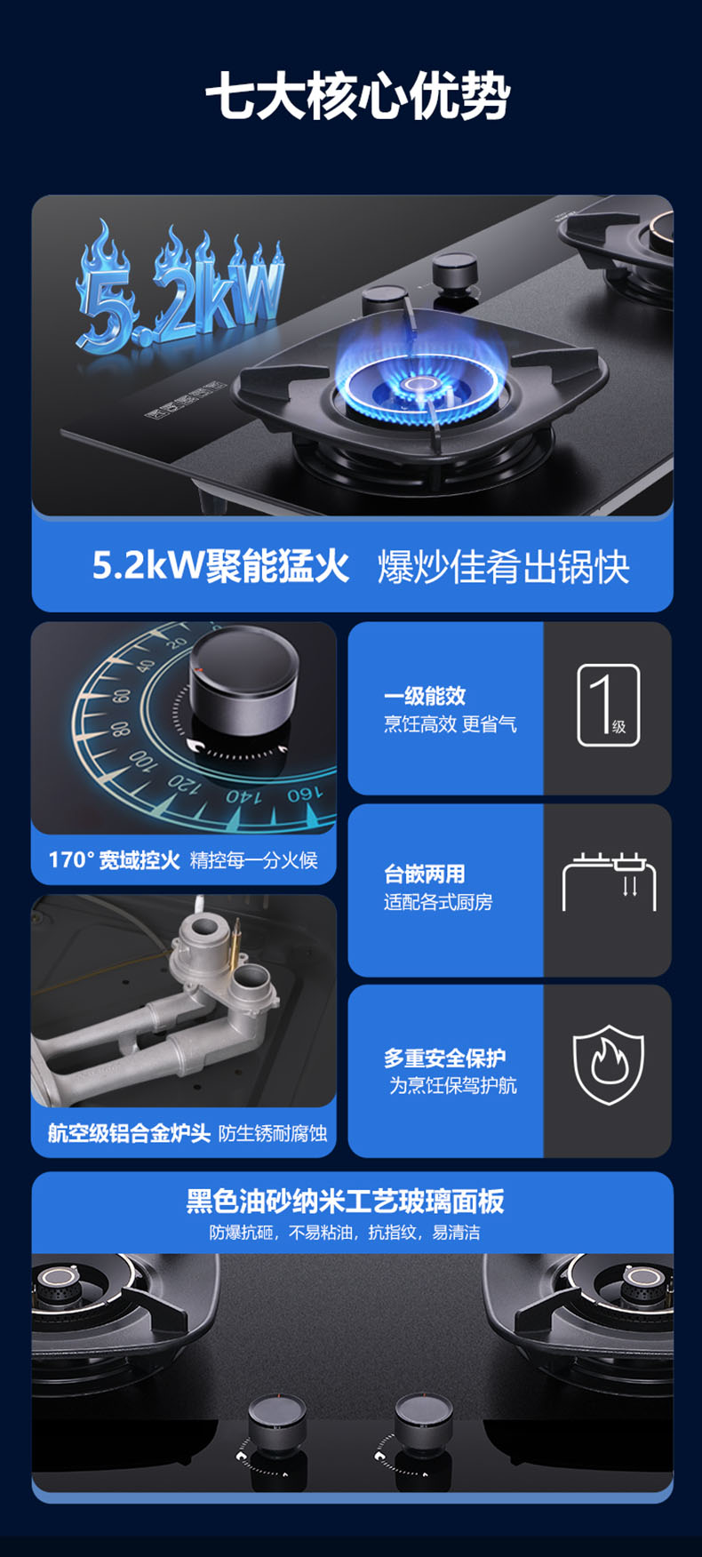 - 三噴引射,立體進(jìn)氣,5.2kW大火力盡享爆炒